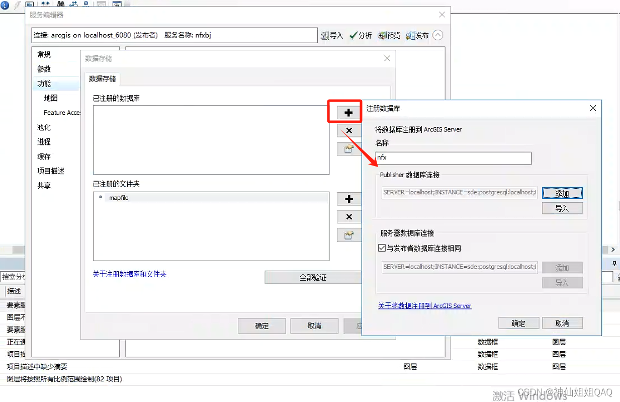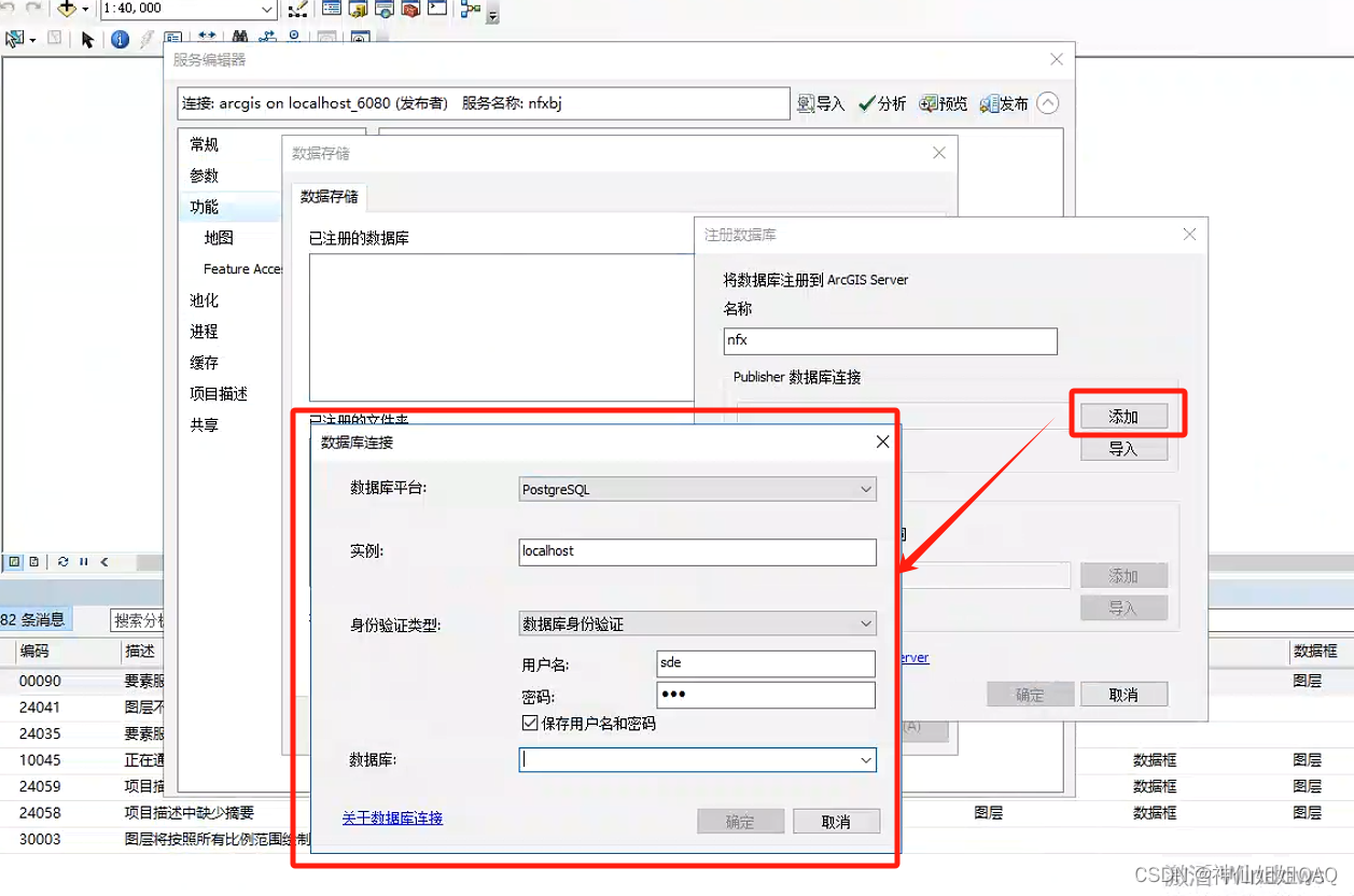 点击添加按钮,配置数据库的基本信息(注意:这里配置的数据库连接需要与连接sde数据库的属性一致)