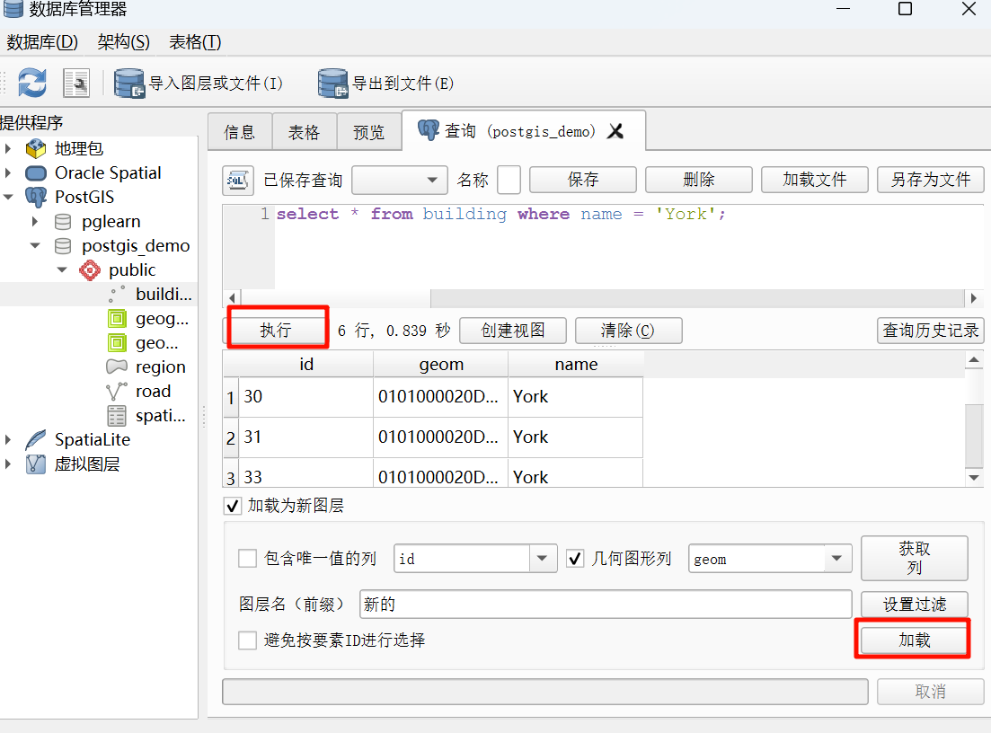 此外,数据库管理器也提供了SQL窗口,通过SQL窗口可以进行查询、查询后加载为新图层等,并且SQL窗口提供了一定的代码补全机制。