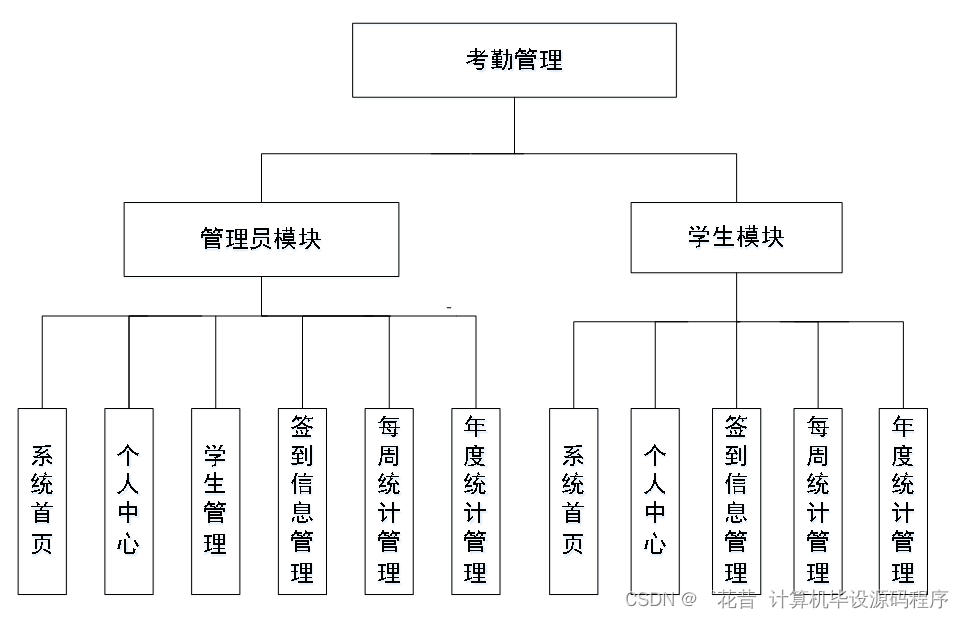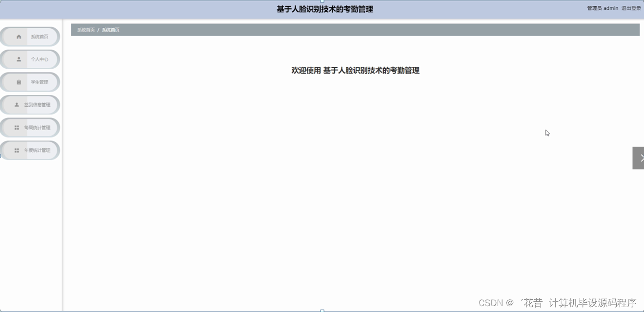 管理员登录系统后,可以对系统首页、个人中心、学生管理、签到信息管理、每周统计管理、年度统计管理等功能进行相应操作,如图5-2所示。