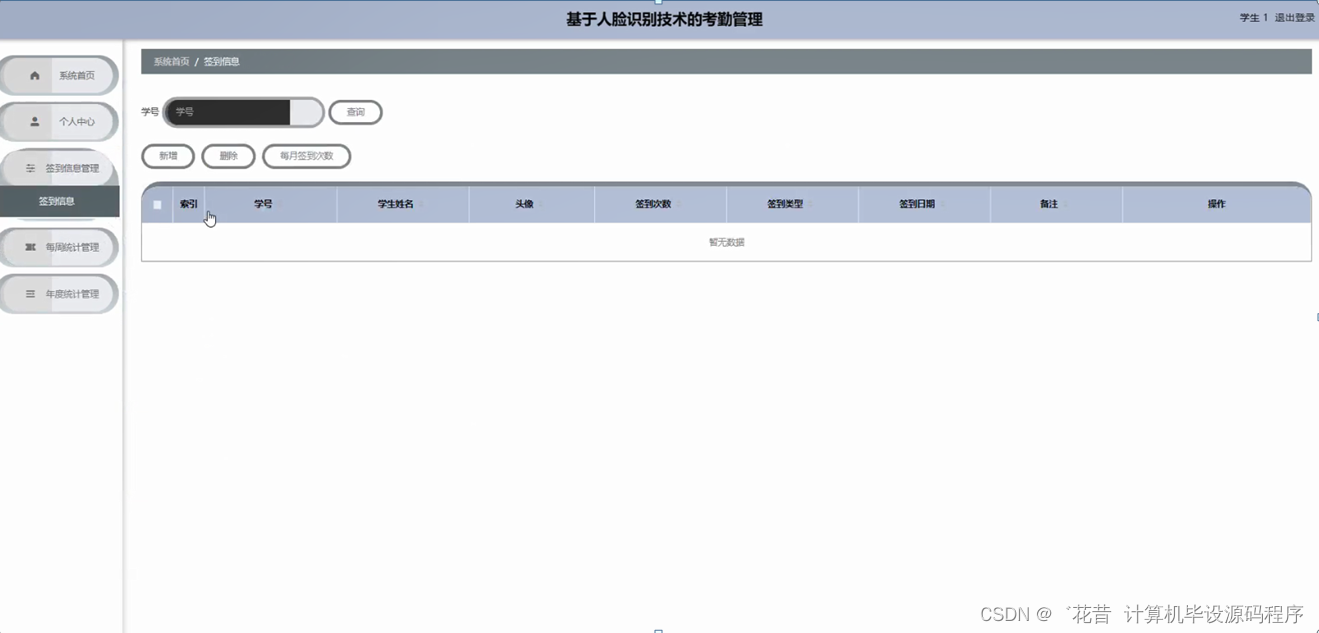 管理员点击签到信息管理;在签到信息管理页面对学号、学生姓名、头像、签到次数、签到类型、签到日期、备注等信息,进行查询或删除签到信息等操作;如图5-4所示。
