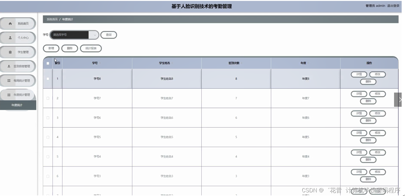 管理员点击年度统计管理;在年度统计管理页面对学号、学生姓名、签到次数、年度等信息,进行查询、新增或删除年度统计等操作;如图5-6所示。