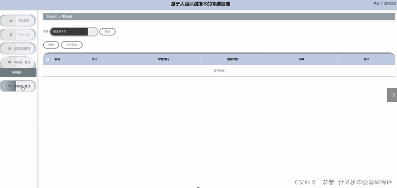学生点击每周统计管理;在每周统计管理页面对学号、学生姓名、签到次数、周数等信息,进行查询或删除每周统计等操作;如图5-11所示。