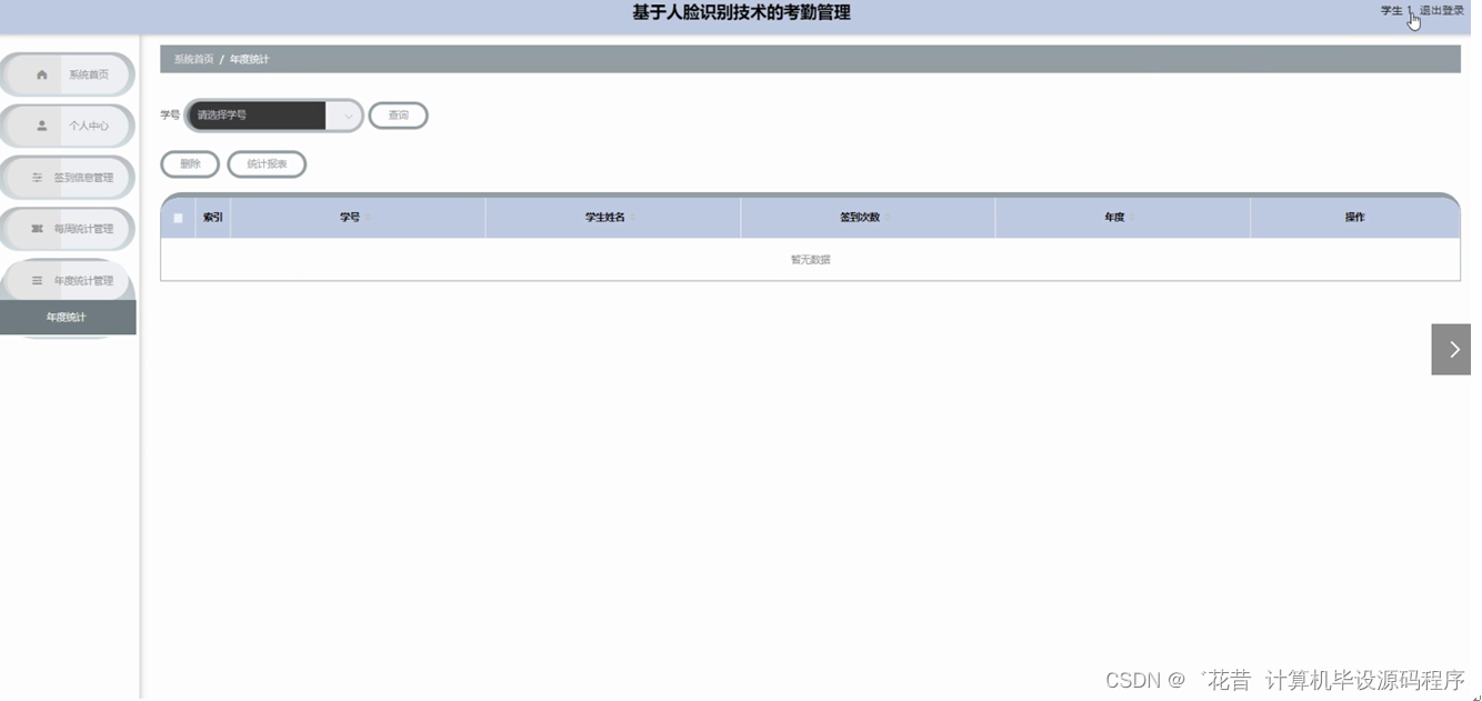 学生点击年度统计管理;在年度统计管理页面对学号、学生姓名、签到次数、年度等信息,进行查询、新增或删除年度统计等操作;如图5-12所示。