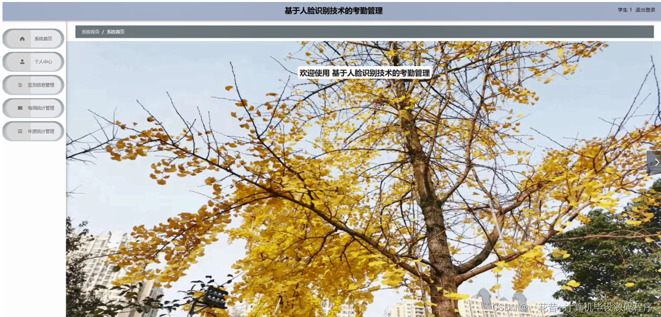 学生登录系统后,可以对系统首页、个人中心、签到信息管理、每周统计管理、年度统计管理等功能进行相应操作,如图5-8所示。