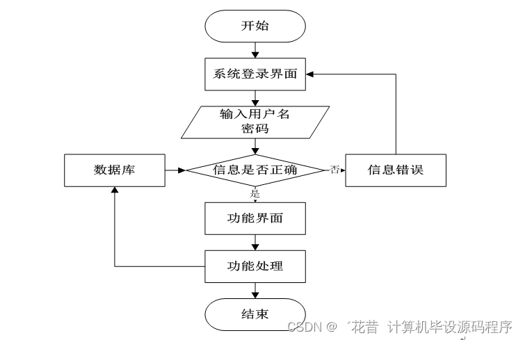 登录流程实现了管理员和其他用户的登录,在登录页面需要用户填写自己的信息,前端页面会将信息传递给后端接口,然后查询数据库确定该身份有效后登录成功,否则此用户登录失败,需要重新填写信息,进行再次验证,如图3-4所示。