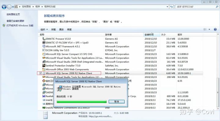 10、在程序列表中找到”Microsoft SQL Server 2012 Native Client”,此项是数据库的客户端,右击选“卸载”(或双击)。