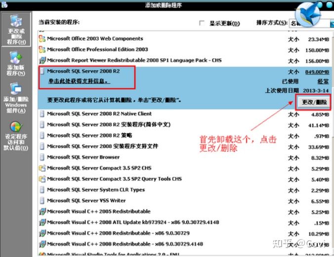 3、在程序列表中找到”Microsoft SQL Server 2008”,右击选“卸载”(或双击)。