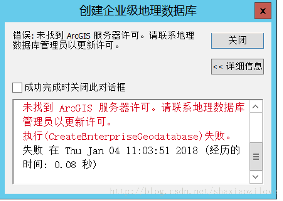5、若是在第一次创建企业级地理数据库的过程中出现问题,后面可能会出现以下图8所示错误: