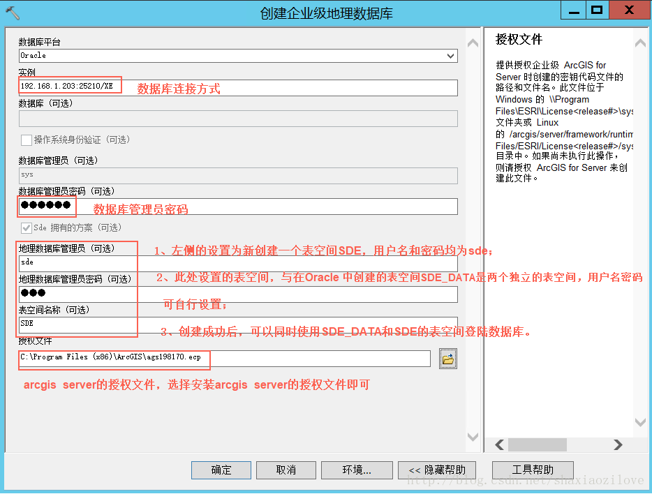 4、正确设置创建企业级地理数据库的各项参数,如下图所示:
