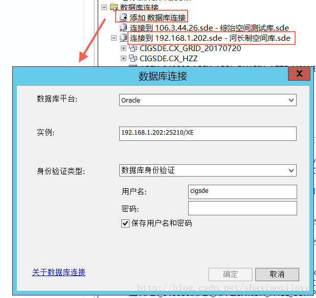 2、安装并正确配置Oracle客户端(可使用绿色版),保证通过ArcCatalog中的 添加数据库连接 可连接上Oracle数据库,如下图所示: