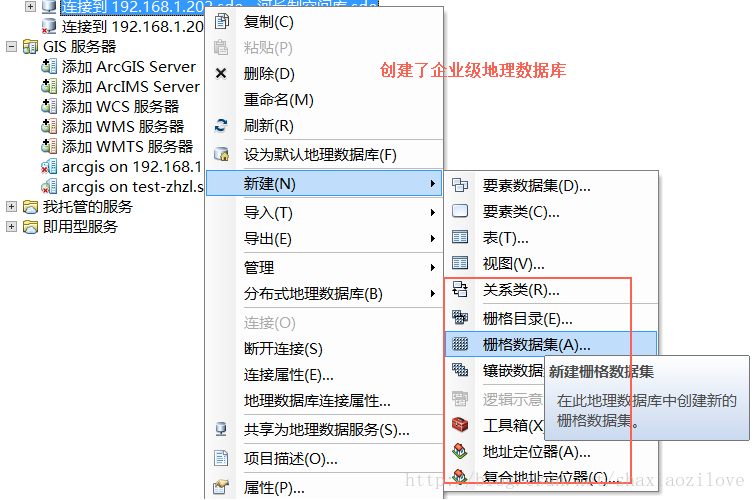 6、可通过在ArcCatalog中连接数据库后,右键“新建”的方式查看创建企业级地理数据库后的效果,如下图所示: