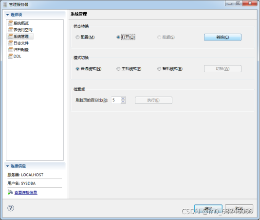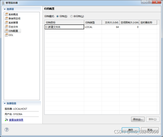 点击“开始-所有程序-达梦数据库-客户端-DM管理工具”,连接需要备份的数据库实例。连接好后,右键点击“管理服务器”,点击“系统管理”,点击“配置”后点击“转换”,点击“归档配置”,选择“归档”,添加归档目标,点击确认,右键点击“管理服务器”,点击“系统管理”,点击“打开”后点击“转换”,点击确定。