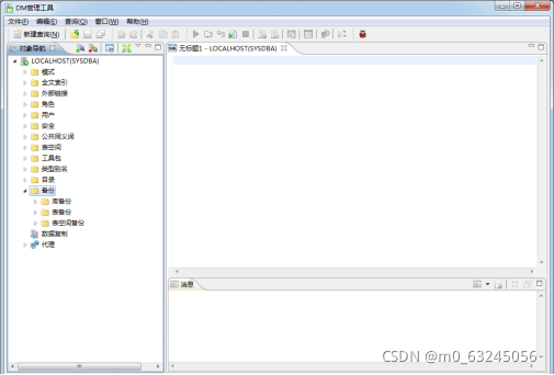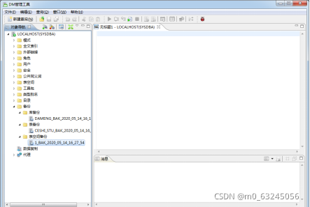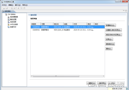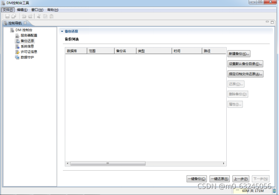 使用CONSOLE工具进行备份还原1.备份操作。点击“开始-所有程序-达梦数据库-客户端-DM控制台工具”。使用CONSOLE工具进行备份还原操作时,要停止数据库,如果不停止会造成数据丢失且会提示错误。可以使用DM服务查看器停止需要备份的数据库实例服务,点击“开始-所有程序-达梦数据库-DM服务查看器-右键停止”。打开DM控制台工具后,选择备份还原,选择待备份目标数据库 dm.ini 文件路径,点