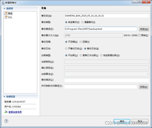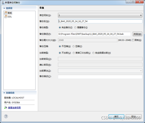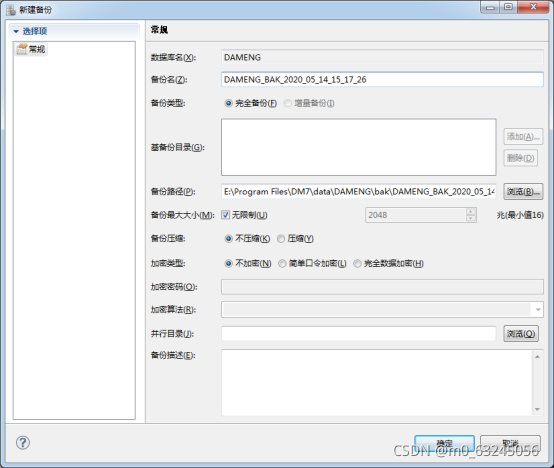 根据实际情况填写备份名;备份路经;选择进行完全备份还是增量备份,在进行增量备份时需要添加基备份目录;是否对备份大小进行限制;备份是否压缩;是否加密。点击确认则进行备份操作,备份文件可通过备份路径查找。