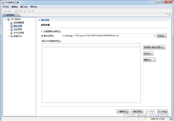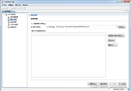 打开DM控制台工具后,选择备份还原,选择待备份目标数据库 dm.ini 文件路径,点击下一步进行详细选择。