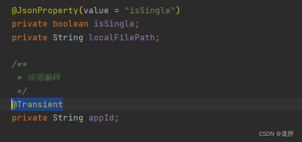 同时MyBatisPlus的@TableField(exit=false)注解也可以满足,当exist=true,标识该属性为数据库表字段,exist=false,标识该属性不为数据库表字段,通常应用在属性上标识该属性不是数据库表字段,但又必须使用。@transient 就是在给某个javabean上需要添加个属性,但是这个属性你又不希望给存到数据库中去,仅仅是做个临时变量,用一下。场景:基于My