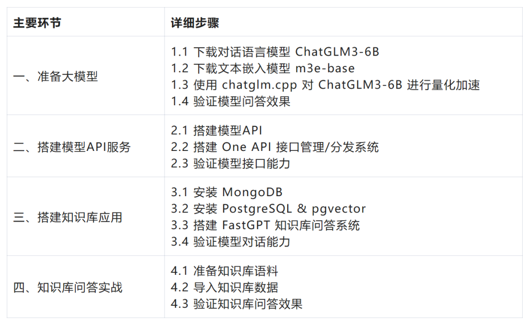 基于 MacBook 的部署方案分为四个主要环节、14个具体步骤,只要一步步实操下去,每位 IT 同学都可以在自己的 MacBook 上拥有属于自己的私有大模型知识库系统,步骤清单如下: