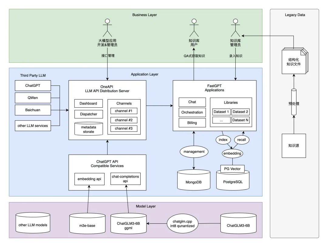 并采用了基于 m3e-base 模型的 embedding search RAG 方案。基于这两个模型封装和 ChatGPT 兼容的 API 接口协议;通过引入 One API 接口管理 & 分发系统,形成统一 LLM 接口渠道管理平台规范,并把封装好的接口协议注册进去;搭建与 Dify.ai 齐名开源大模型知识库平台管理系统 FastGPT,实现集私有知识数据源预处理、嵌入检索、大模型对话一体的完整知识库应用流程。