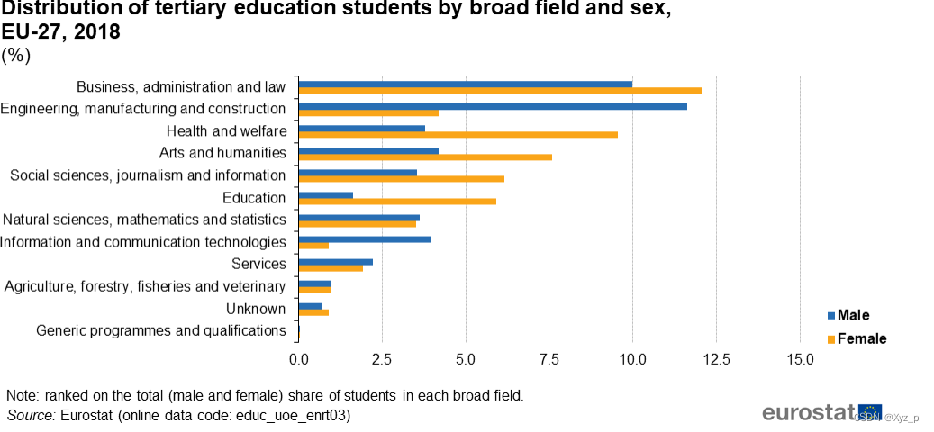 根据欧盟统计局人数最多的研究领域是: