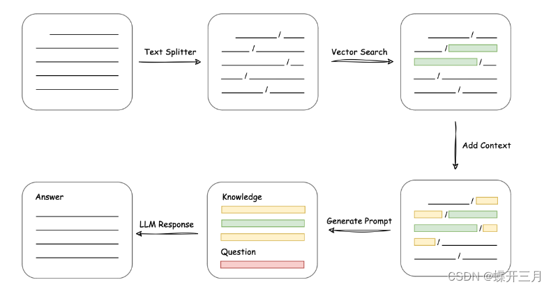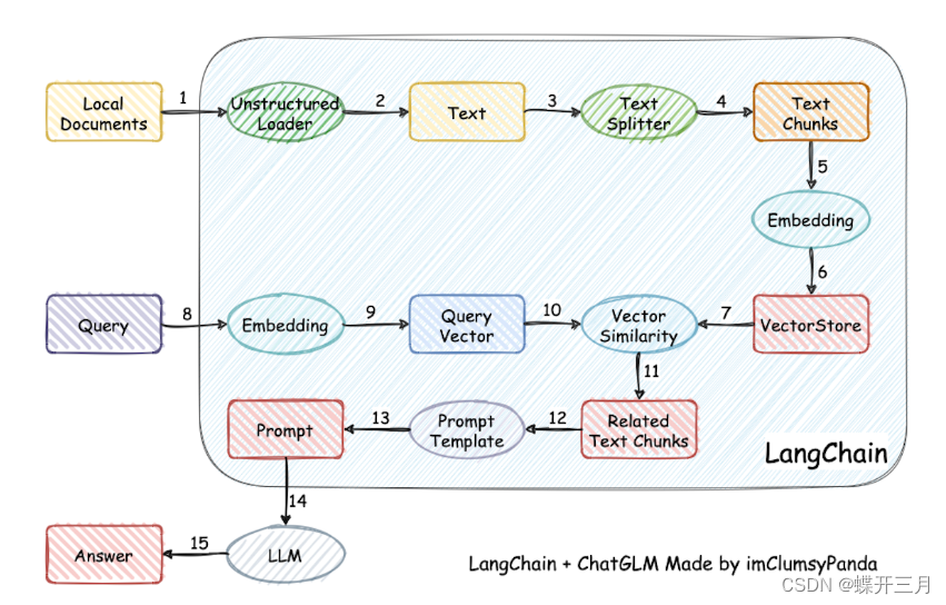 项目实现原理如下图所示,过程包括加载文件 -> 读取文本 -> 文本分割 -> 文本向量化 -> 问句向量化 -> 在文本向量中匹配出与问句向量最相似的top k个 -> 匹配出的文本作为上下文和问题一起添加到 prompt 中 -> 提交给 LLM 生成回答。