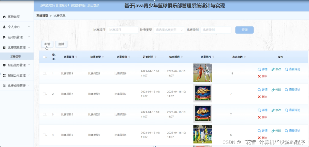 系统管理员点击比赛信息管理。在比赛信息页面输入比赛项目、比赛类型和比赛级别进行查询、新增或删除比赛信息列表,并根据需要对比赛信息详情信息进行详情、修改、查看评论或删除操作;如图5-15所示: