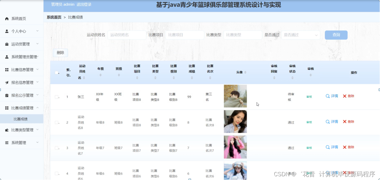 管理员点击比赛成绩管理。在比赛成绩页面输入运动员姓名、比赛项目、比赛类型和是否通过进行查询或删除比赛成绩列表,并根据需要对比赛成绩详情信息进行详情或删除操作;如图5-10所示: