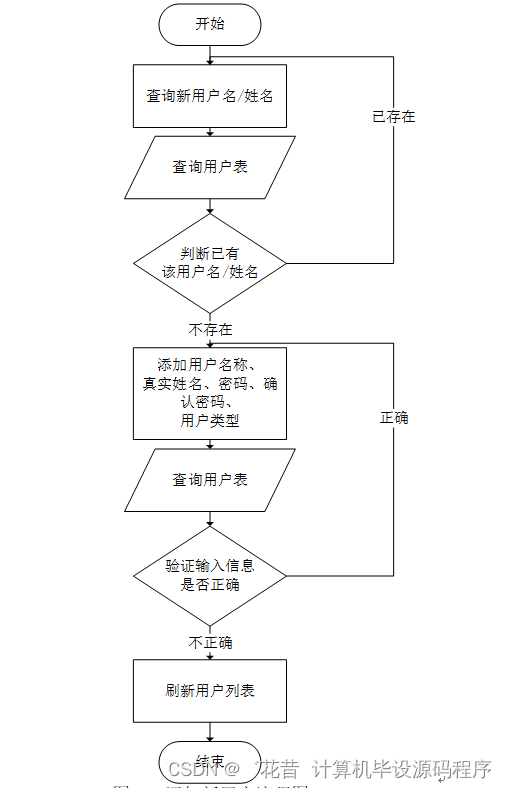 添加新用户的流程是先查询新用户名是否已存在,如已有该用户名,需重拟用户名并同时输入新用户的其它信息,添加新用户到数据库时会先验证数据是否完整,信息都正确且完整时,返回并刷新用户列表;信息不正确时,会返回输入信息的那一步。该流程如图3-5所示。