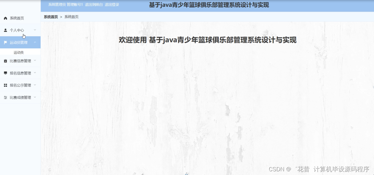 管理员进入主页面,主要功能包括对个人中心、运动员管理、系统管理员管理、比赛信息管理、报名信息管理、报名公示管理、比赛成绩管理、比赛类型管理、系统管理等进行操作。管理员主界面如图5-7所示: