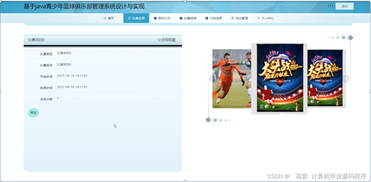 比赛信息:在比赛信息页面的输入栏中输入比赛项目、比赛类型和比赛级别进行查询,可以查看到比赛信息详情信息,并根据需要对比赛信息详情信息进行报名或收藏操作,比赛信息详情页面如图5-4所示: