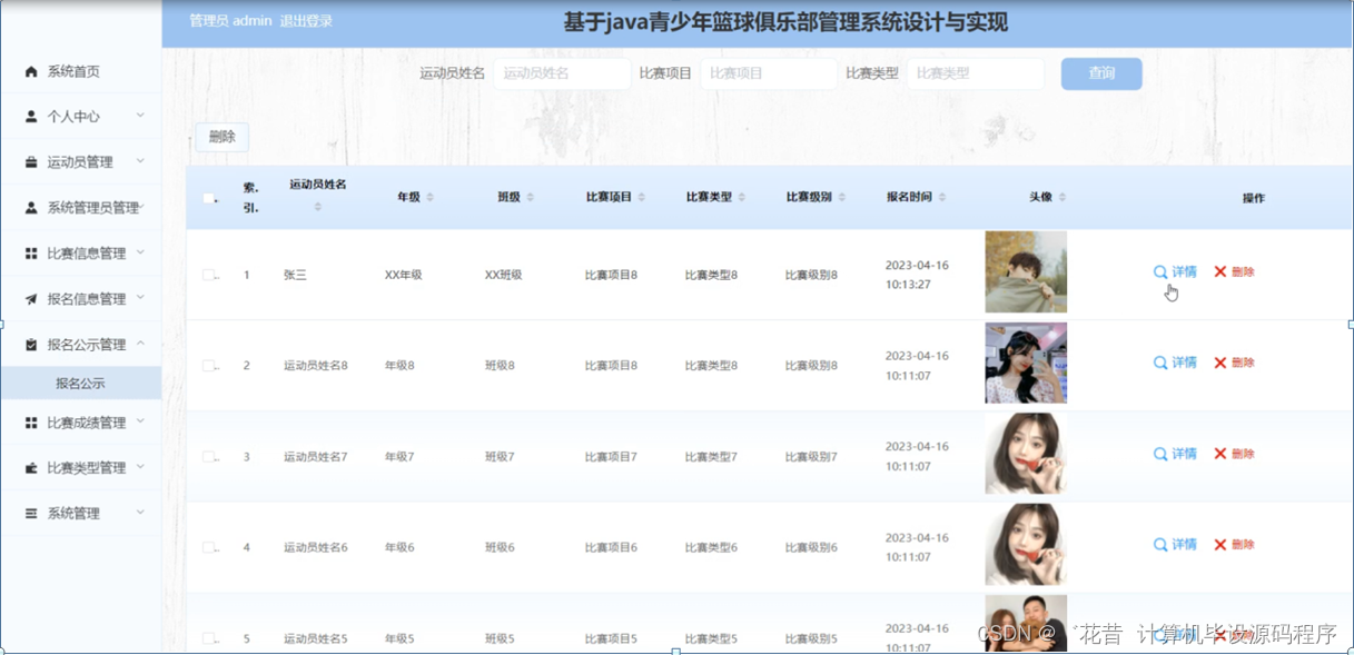 管理员点击报名公示管理。在报名公示页面输入运动员姓名、比赛项目和比赛类型进行查询或删除报名公示列表,并根据需要对报名公示详情信息进行详情或删除操作;如图5-9所示: