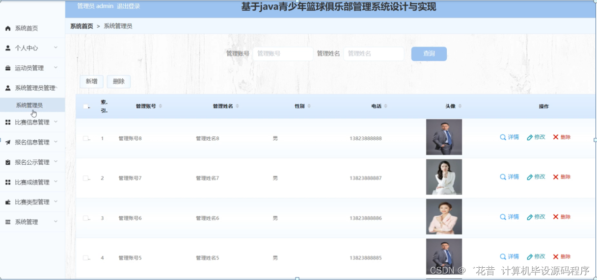 管理员点击系统管理员管理。在系统管理员页面输入管理账号和管理姓名进行查询、新增或删除系统管理员列表,并根据需要对系统管理员详情信息进行详情、修改或删除操作;如图5-8所示:
