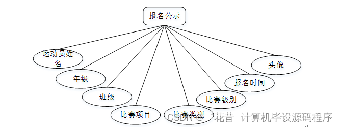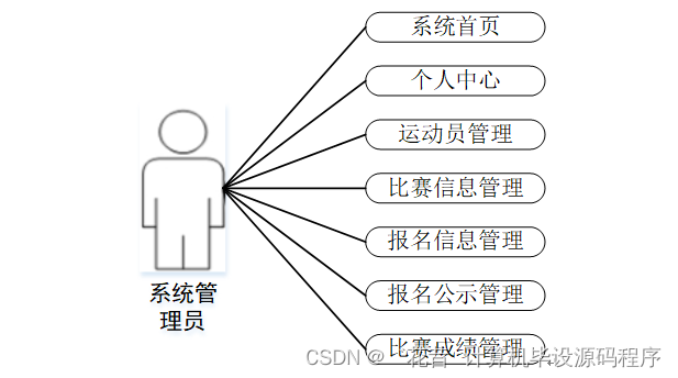 (2)、系统管理员关键功能包含个人中心、运动员管理、比赛信息管理、报名信息管理、报名公示管理、比赛成绩管理等进行管理。系统管理员用例如下: