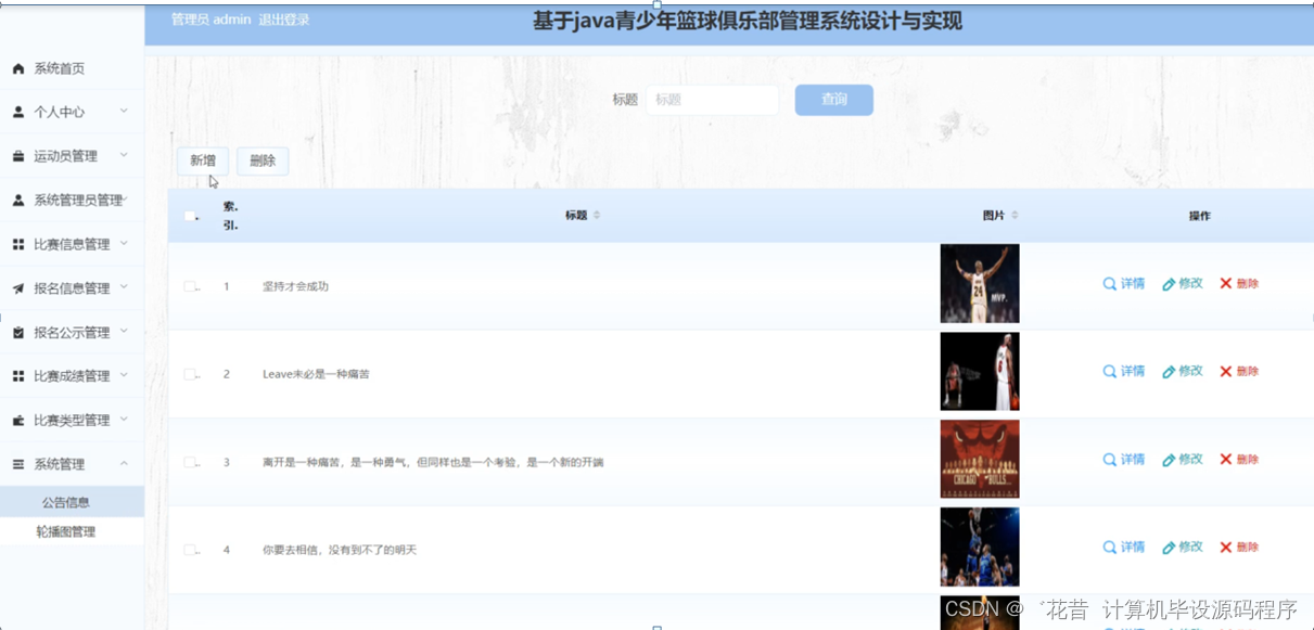 管理员点击系统管理。在公告信息页面输入标题进行查询、新增或删除公告信息列表,对公告信息详情信息进行详情、修改或删除操作;并根据需要对轮播图管理进行相应操作,如图5-12所示: