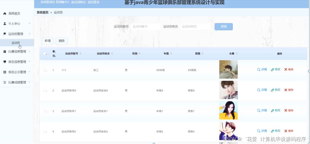 系统管理员点击运动员管理。在运动员页面输入运动员账号和运动员姓名进行查询、新增或删除运动员列表,并根据需要对运动员详情信息进行详情、修改或删除操作;如图5-14所示: