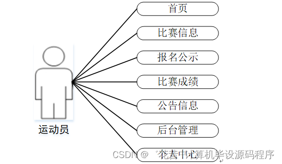 (3)、运动员关键功能包含首页、比赛信息、报名公示、比赛成绩、公告信息、后台管理、个人中心等进行管理。运动员用例如下: