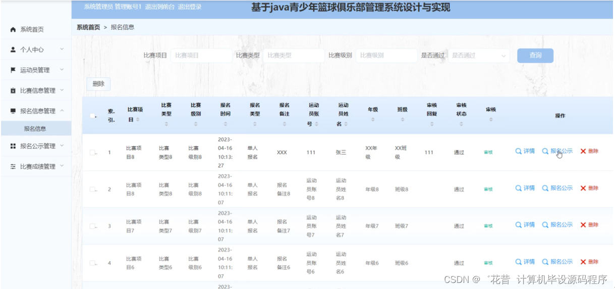 系统管理员点击报名信息管理。在报名信息页面输入比赛项目、比赛类型、比赛级别和是否通过进行查询或删除报名信息列表,并根据需要对报名信息详情信息进行详情、报名公示或删除操作;如图5-16所示: