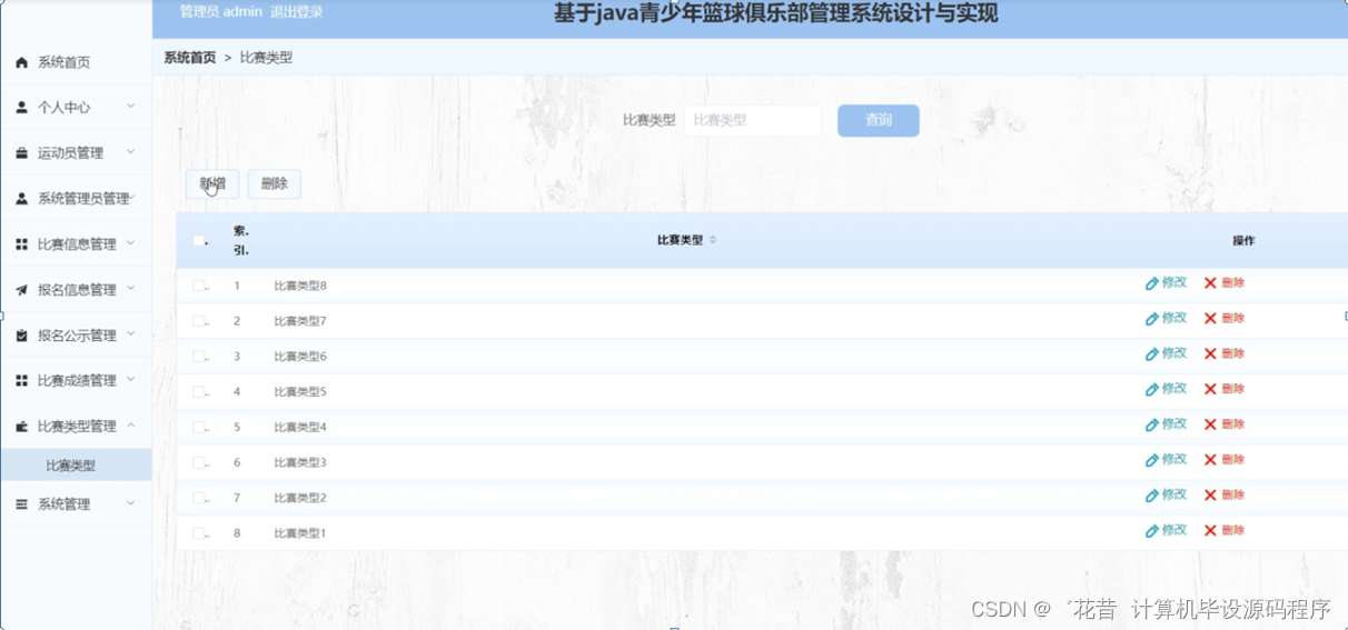 管理员点击比赛类型管理。在比赛类型页面输入比赛类型进行查询、新增或删除比赛类型列表,并根据需要对比赛类型详情信息进行修改或删除操作;如图5-11所示: