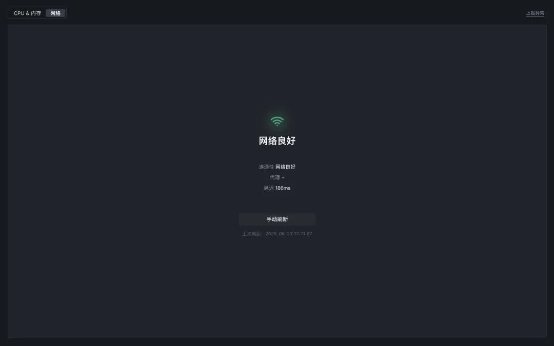 在 网络 页签中,可实时查看 TRAE IDE 的网络连通性、代理及网络延迟信息。此外,还可以通过点击 手动刷新 按钮来实时更新网络状态。