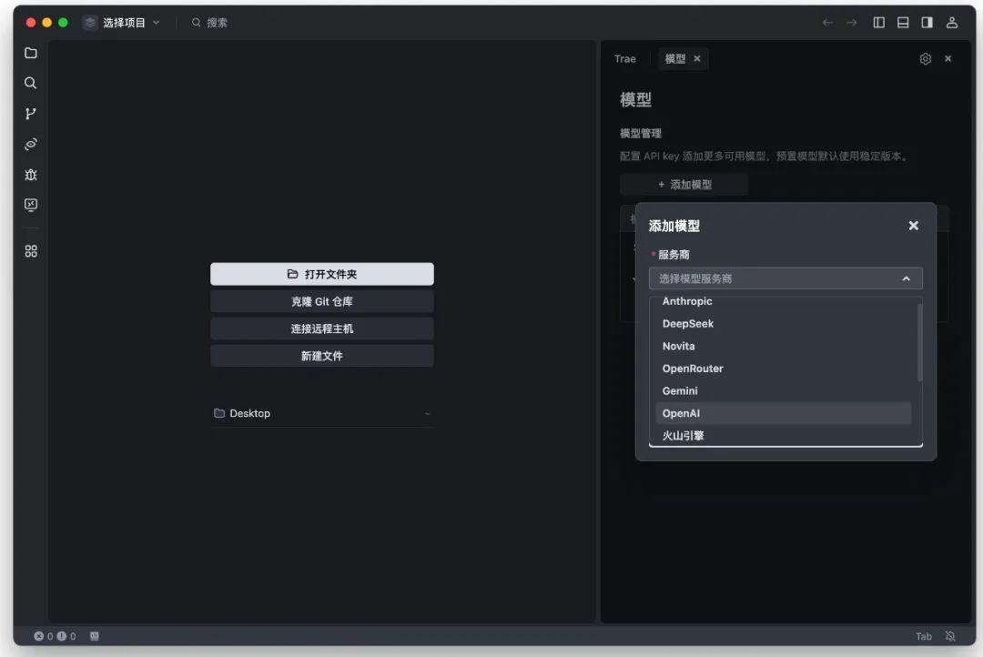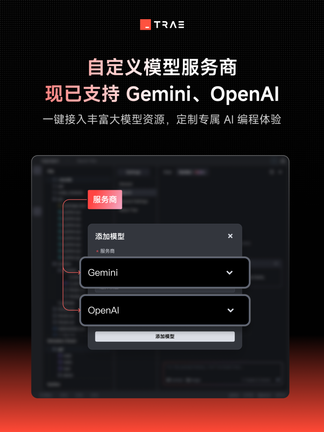 TRAE 自定义模型服务商新增 Gemini 和 OpenAI ,支持通过 API 密钥(API Key) 接入 Gemini 和 OpenAI 平台中的多款适合编码的模型,满足高阶开发者对模型多样性、专业性的定制需求。