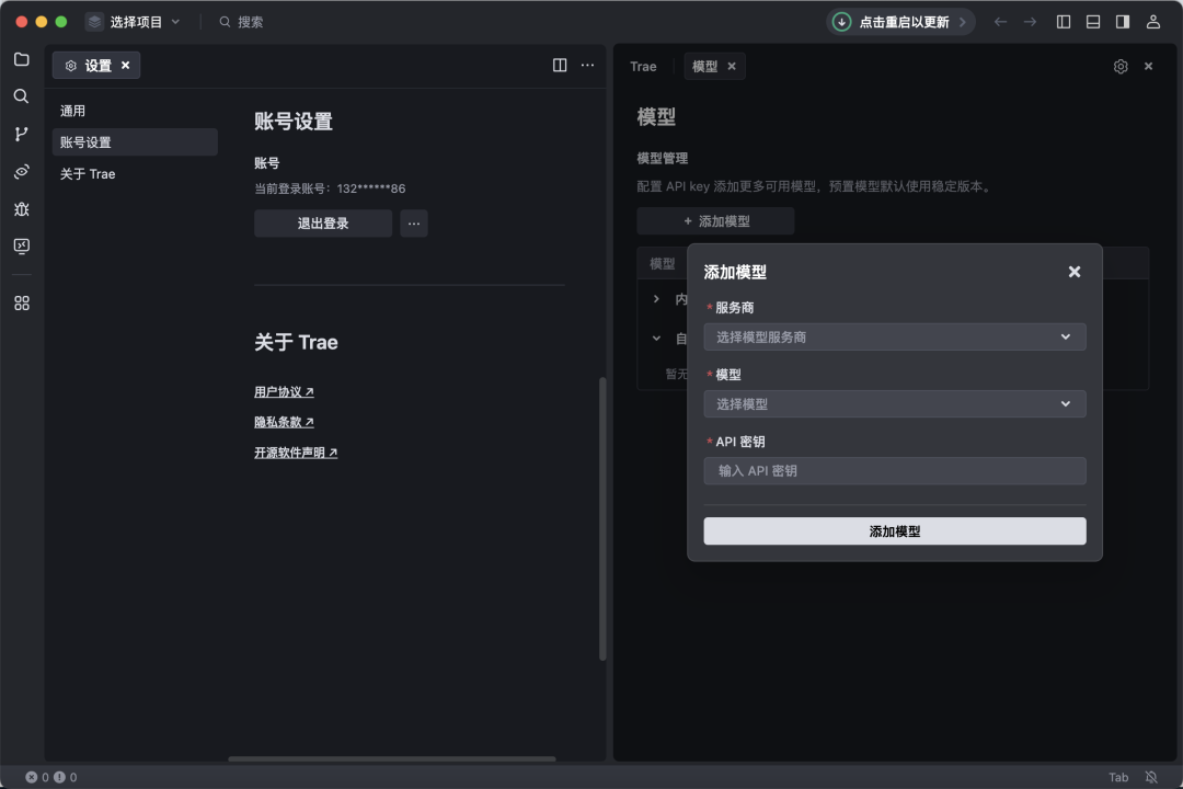点击**“添加模型”** 按钮,TRAE 将调用服务商的接口来检测 API 密钥是否有效。可能的结果如下: