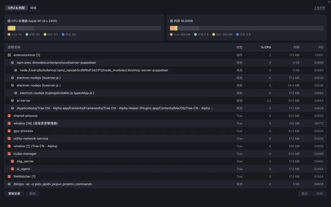 开发卡顿?资源异常?TRAE 新增进程资源管理器功能 让你对 IDE 运行状态了如指掌,实时监控资源消耗与网络状况,管理进程资源,保障 IDE 的稳定运行。