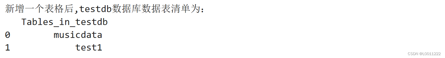 print('新增一个表格后,testdb数据库数据表清单为:\n',formlist1)