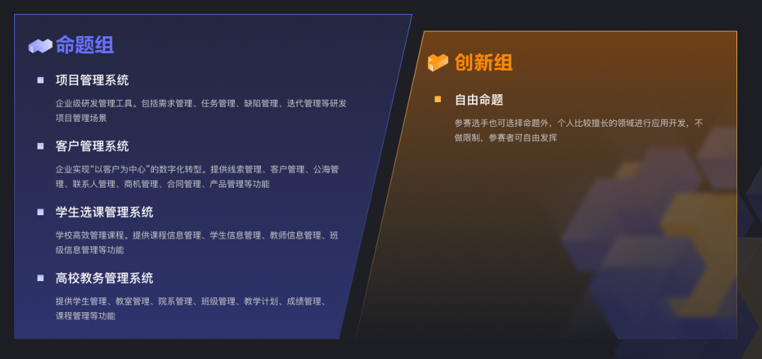 和之前不同的是,本次大赛设立两大组别,分别为命题组与创新组。命题组选用项目管理系统、客户管理系统、学生选课管理系统、高校教务管理系统4大方向为题,以明确而又贴近实际生活的方向,让参赛选手更好发挥。创新组则由选手自行选择主题,以个人比较擅长的领域进行应用开发。