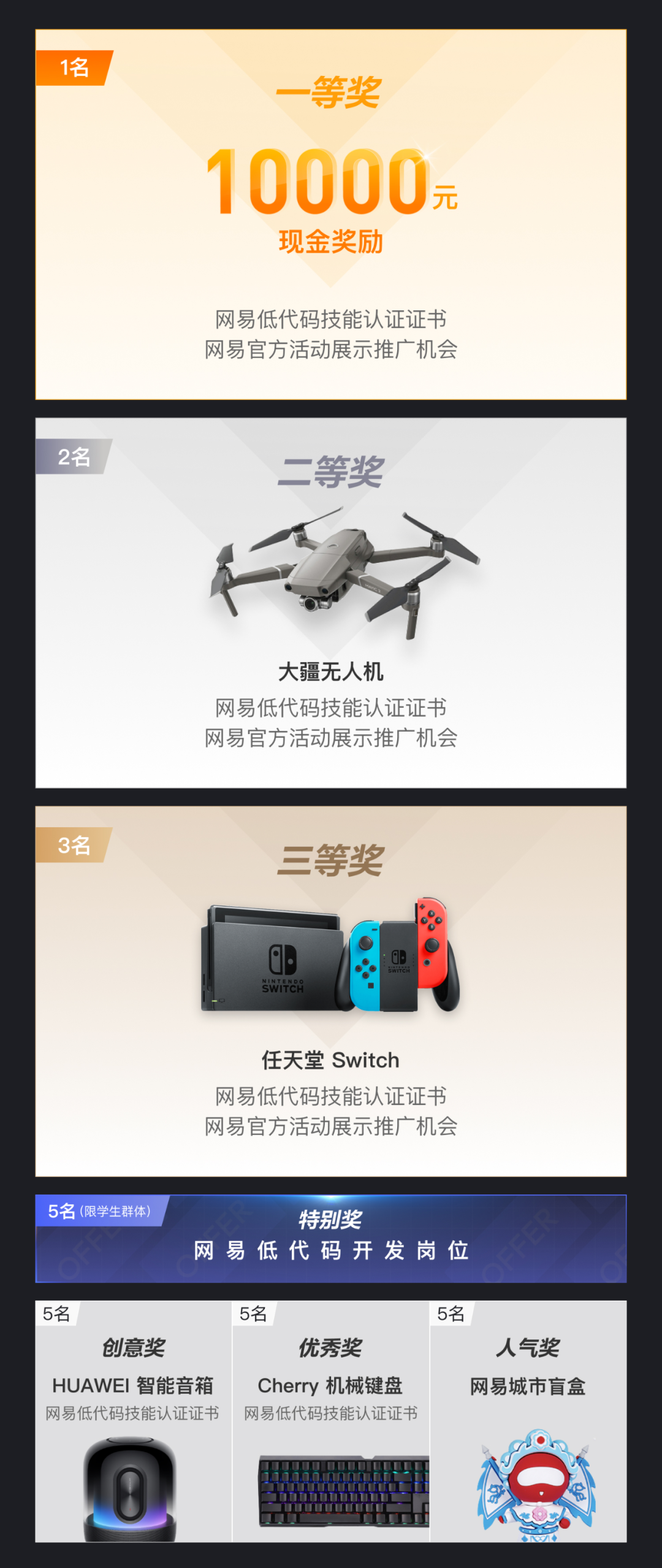 奖品除了万元大奖、大疆无人机、任天堂Switch外,针对高校学生更开放5个特别奖名额——猪厂工作机会已备好,来一起做同事吧!