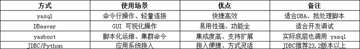 yasboot 是崖山数据库的综合运维工具,内嵌了 yasql 的功能,适合做脚本化批处理和故障排查。