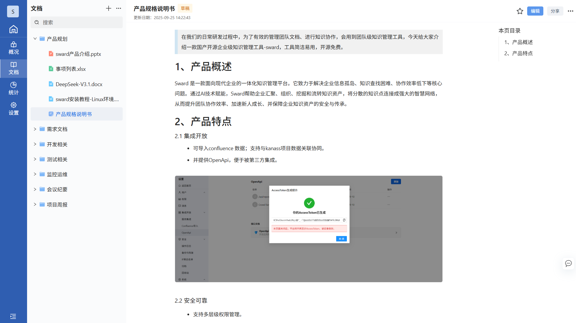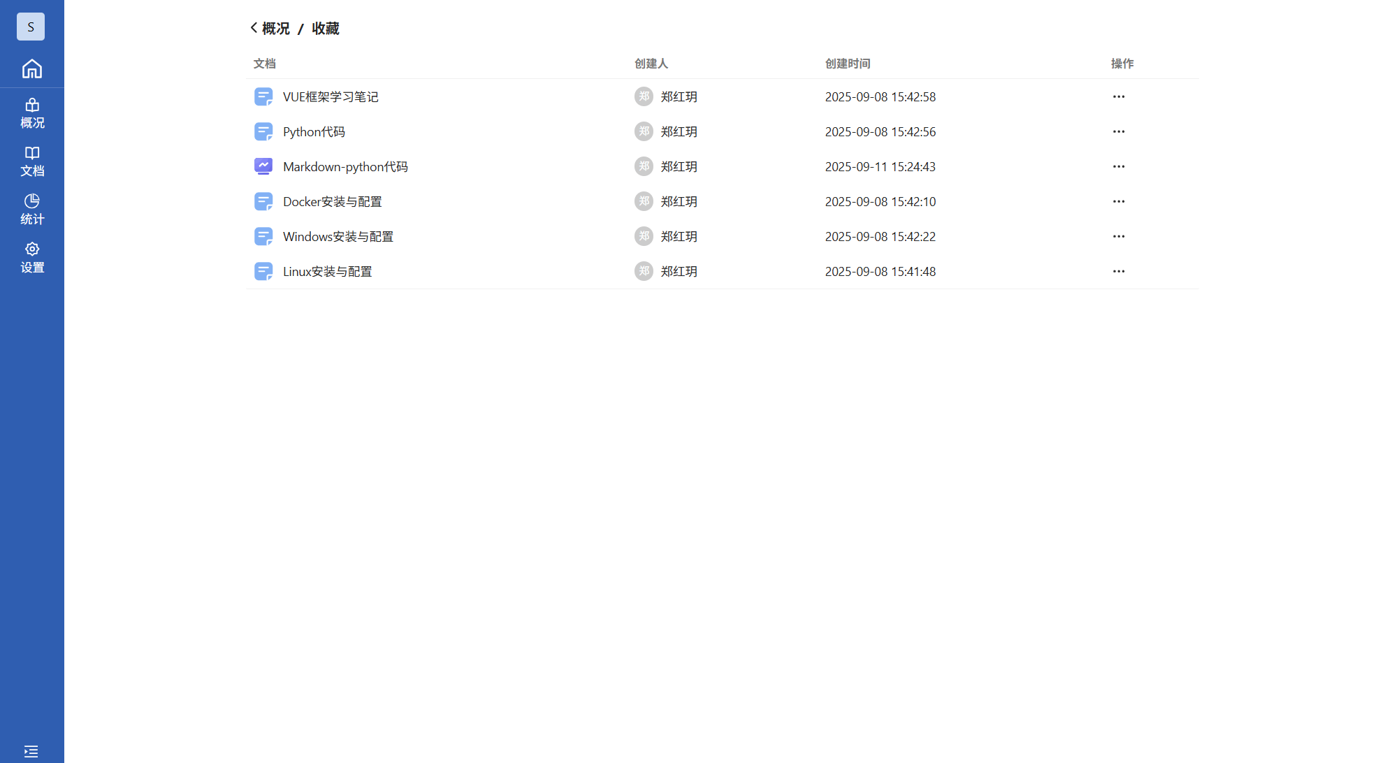 知识库中有目录和文档两个模块,还有概况页面和收藏的文档页面。