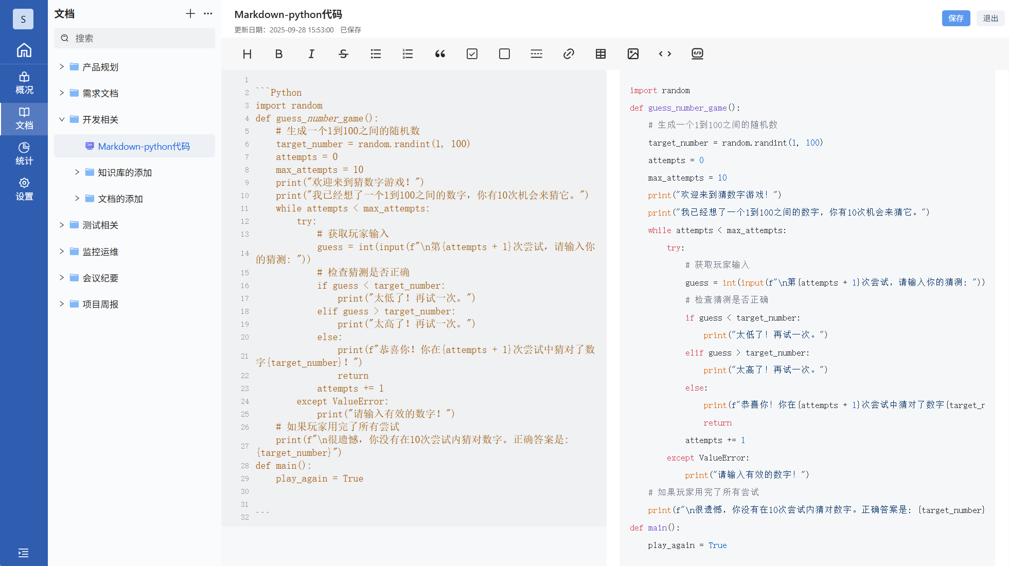 根据上面表格描述的路径点击,选择添加Markdown,就跳转到文档添加页面,这时候文档就已经添加成功了,默认名字是未命名文档。