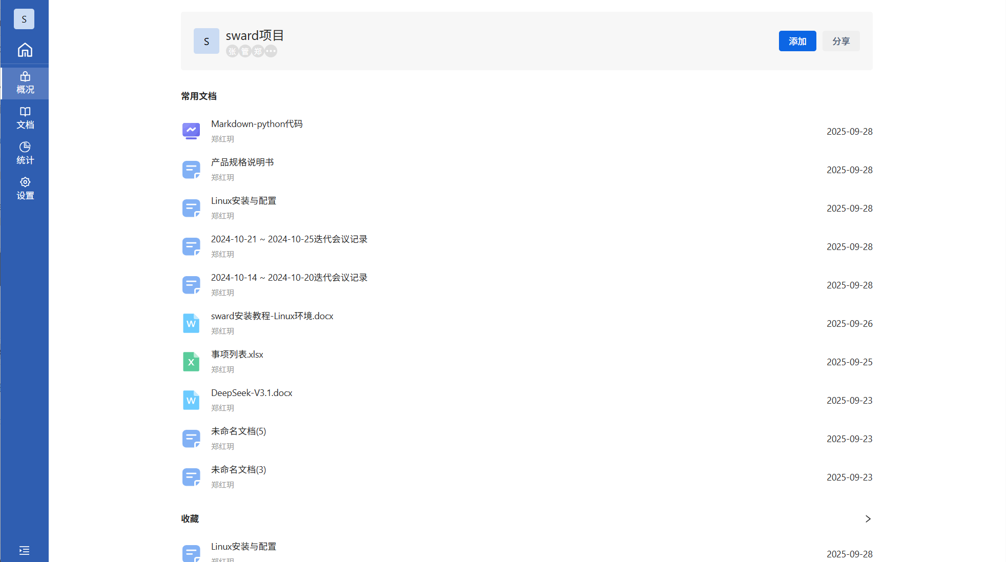 在文档页面,点击收藏按钮,就收藏了该文档;点击概况->收藏,进入到收藏页面,可以看到收藏的全部文档,可在此页面查看编辑文档