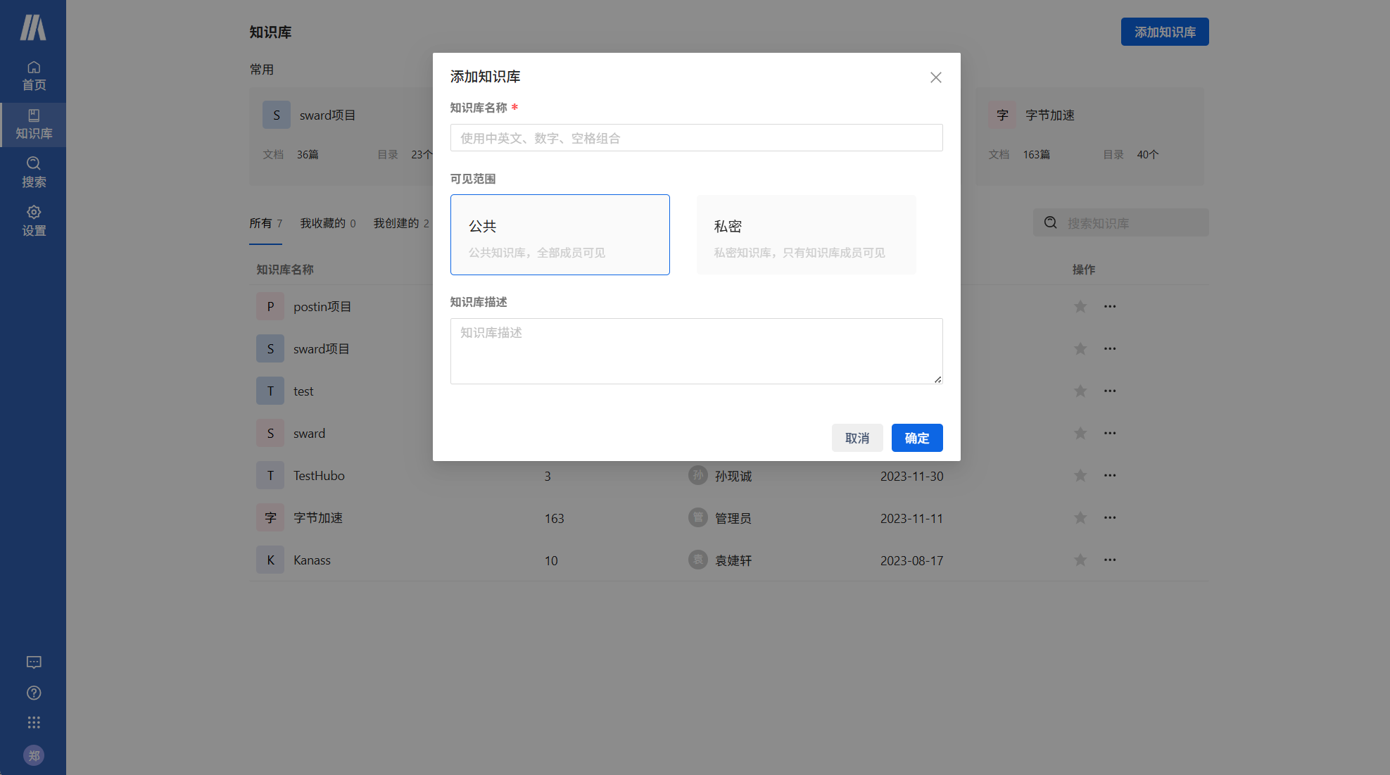 公共知识库,系统中所有的成员都可以进入到知识库查看 私密知识库,只有此知识库的成员才可以在知识库列表中看到 |