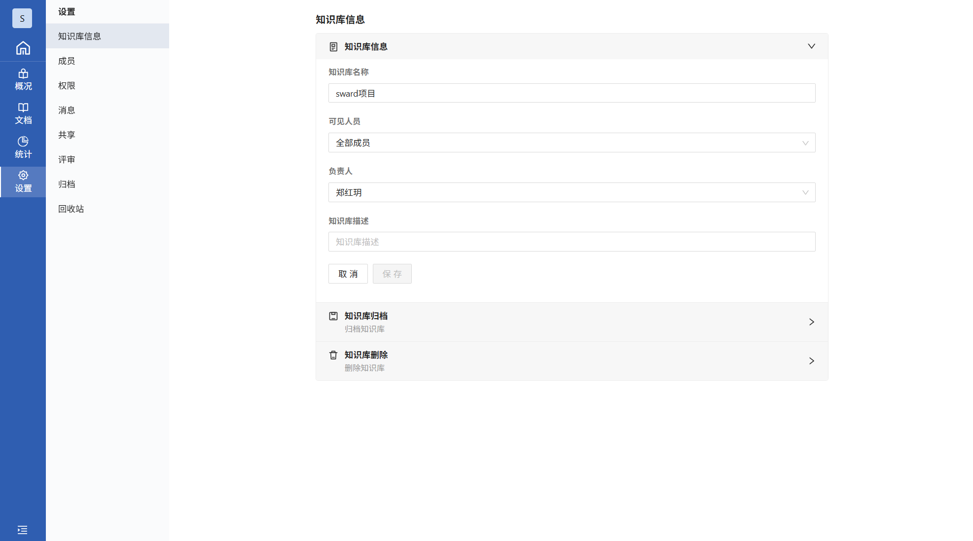 知识库中有基本信息配置,成员与权限配置,还有归档与放入回收站的目录与文档管理